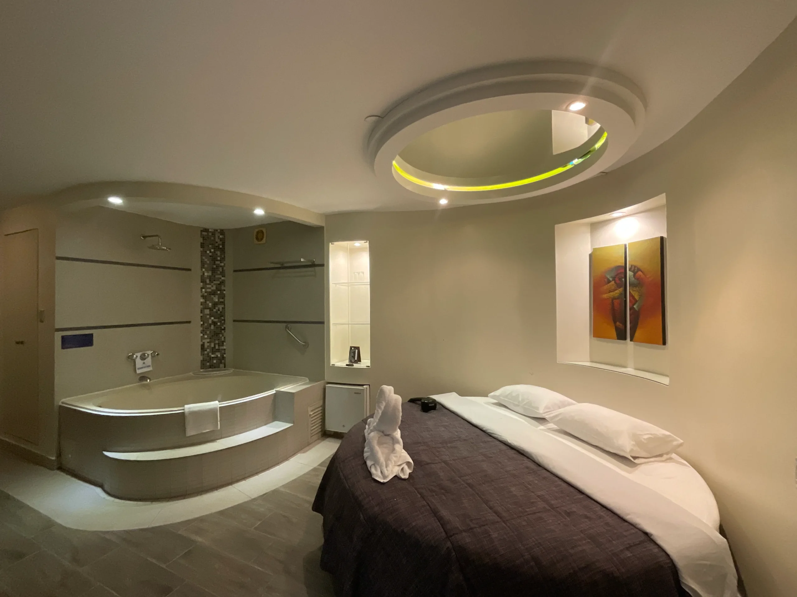 Cama redonda con elegante espejo en el techo, Jacuzzi con ducha española e hidromasaje, agua caliente, cable TV, baño privado, frigobar wifi, amenities (jabones, champús y gel de jacuzzi), 02 toallas de cuerpo, 02 toallas de mano y 01 toalla de piso. Además, cuenta con masajeador y secadora disponible. El costo es de S/. 260.00 por noche (31 m2).